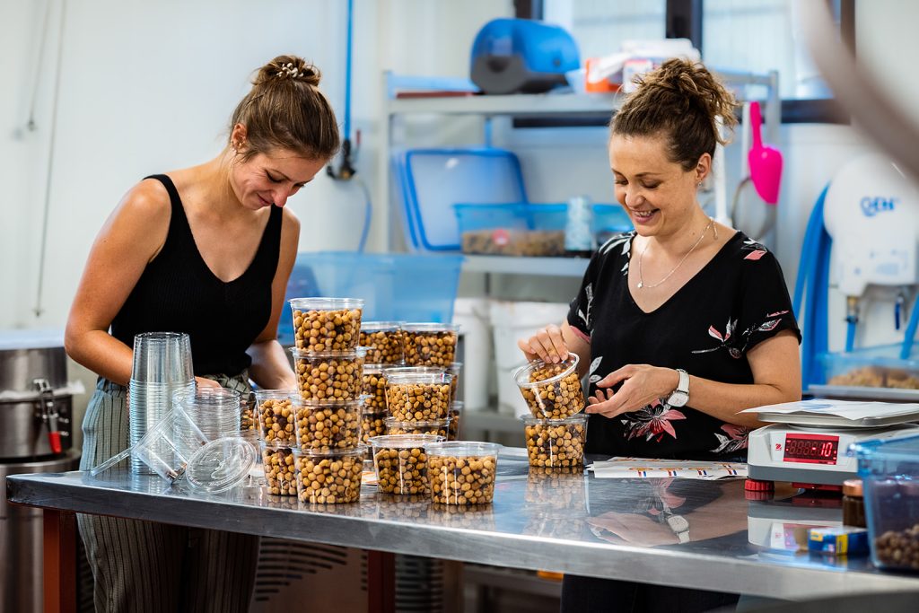 Les fruits à coque sont directement transformés dans notre atelier d’Albias (82) : pâte à tartiner, crème de marrons, cerneaux de noix, noisettes apéro aromatisée aux épices, huiles de noix et noisette… L’atelier est dirigé par l’équipe féminine Marion et Séverine, qui a imaginé et testé les recettes, et sélectionné les machines de production.