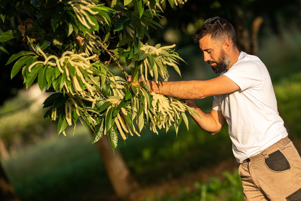 Après des études agricoles, Aurélien prend la relève de ses parents et modernise les procédés de culture, met en place la technique de la conservation des sols, et une agriculture raisonnée. Passionné, il ne cesse de s’informer sur toutes les innovations agricoles partout dans le monde, toujours dans le but mieux prendre soin de ses arbres. Devenu également pépiniériste, Aurélien produit aussi les plants de châtaigniers.